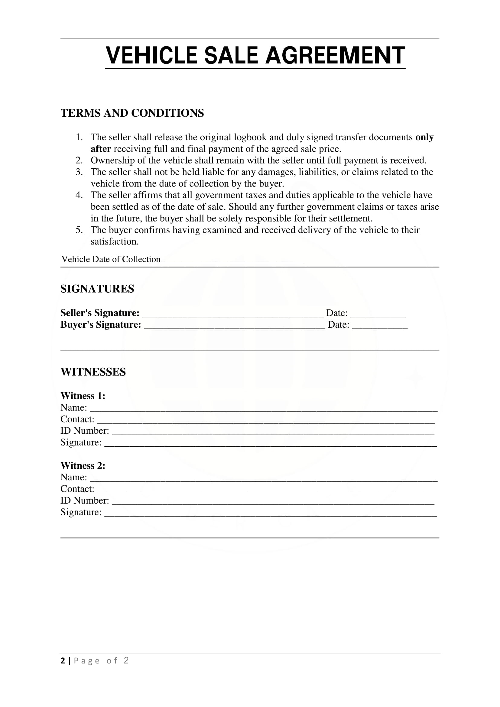 Vehicle Collection Date: The agreement now includes a section where the parties can specify the exact date the vehicle will be collected—ensuring clarity and accountability.