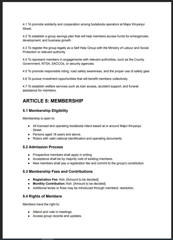 This professional, editable template provides a clear structure for creating your group’s constitution. Whether you’re forming a boda boda group, women’s savings group, youth association, or any other community-based group, this document will guide you through each step.